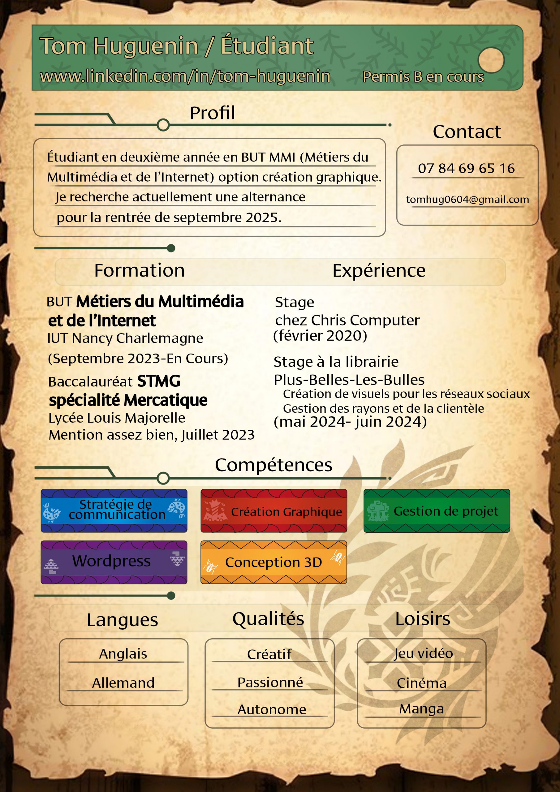 Salut, je m’appelle Tom Huguenin, étudiant à l’IUT Nancy Charlemagne. Je suis en 2ième année de BUT MMI (Métier du Multimédia et de l’Internet)
